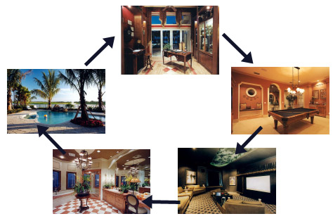 We have provided you with a preconfigured workspace named "Sample Home". This workspace contains the following five layers (the five pictures in this sample workspace are embedded within the database file): ![]() Launch VisiLaunch and open the workspace named "Sample Home". The VisiLaunch Tool will automatically be in "Run" mode, so you can immediately navigate through your "home". Anytime you see the cursor change to a pointing hand, you know you are over a link. For the sample home, the only links we have set are other layer links. It is up to you to setup other types of links within each of your "rooms".