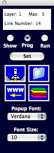 The VisiLaunch Tool is the key to creating links in any room (on any picture): ![]() The top display area in the tool provides you with link and layer information. Specifically, the current Layer number, the Maximum number of layers in this workspace, and the number of Links within the current Layer. VisiLaunch permits you to create up to 100 links within each Layer. The number of Layers is limited only by hard disk space (practically unlimited). Below the information display area there are three radio buttons: Show, Prog (Program), and Run. When the "Show"