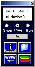 The VisiLaunch Tool is the key to creating links on a picture: ![]() The top display area in the tool provides you with link and layer information. Specifically, the current Layer number, the Maximum number of layers in this workspace, and the number of Links within the current Layer. VisiLaunch permits you to create up to 100 links within each Layer. The number of Layers is limited only by hard disk space (practically unlimited). Below the information display area there are three radio buttons: Show, Prog (Program), and Run. When the "Show"