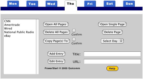 2. Enter a Title and the URL of a page you wish to have opened the selected day of the week. Click the "Add" button. This will add the page to the list. URLs can be entered with or without "http://". For example, using any of these URL formats will all open the same URL: